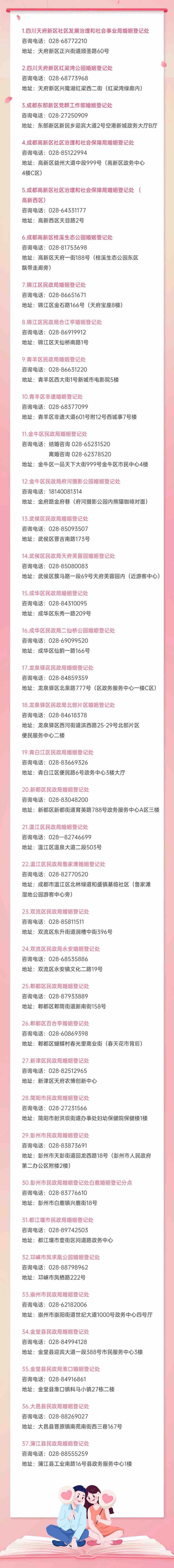 七夕当天,除龙泉驿区北部片区婚姻登记处、成都高新区社区治理和社会保障局,婚姻登记处(高新西区)、温江区民政局婚姻登记处(温江区温泉大道二段503号)这三个婚姻登记点位未提供延时服务之外,全市其余婚姻登记处都可以办理婚姻登记。