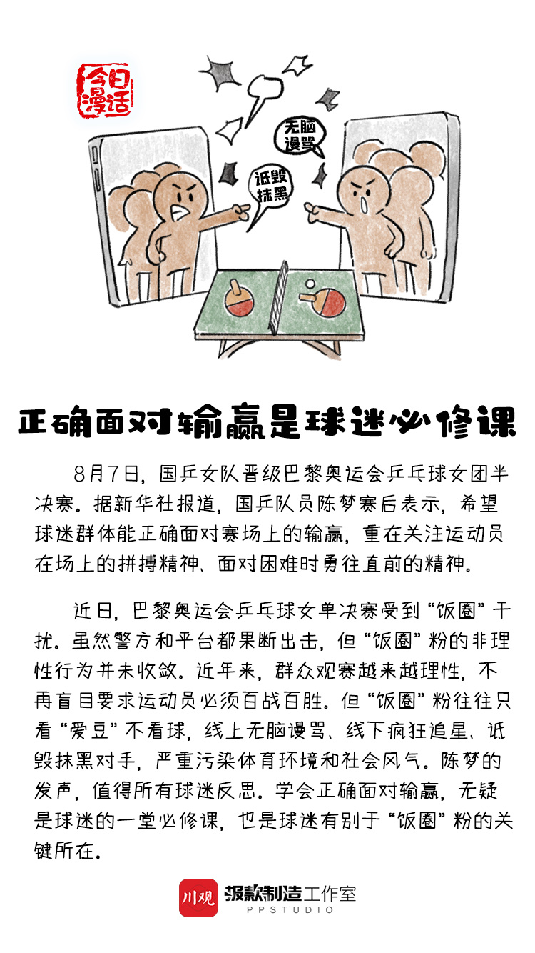 8月7日,国乒女队晋级巴黎奥运会乒乓球女团半决赛。据新华社报道,国乒队员陈梦赛后表示,希望球迷群体能正确面对赛场上的输赢,重在关注运动员在场上的拼搏精神、面对困难时勇往直前的精神。对此,你怎么看?