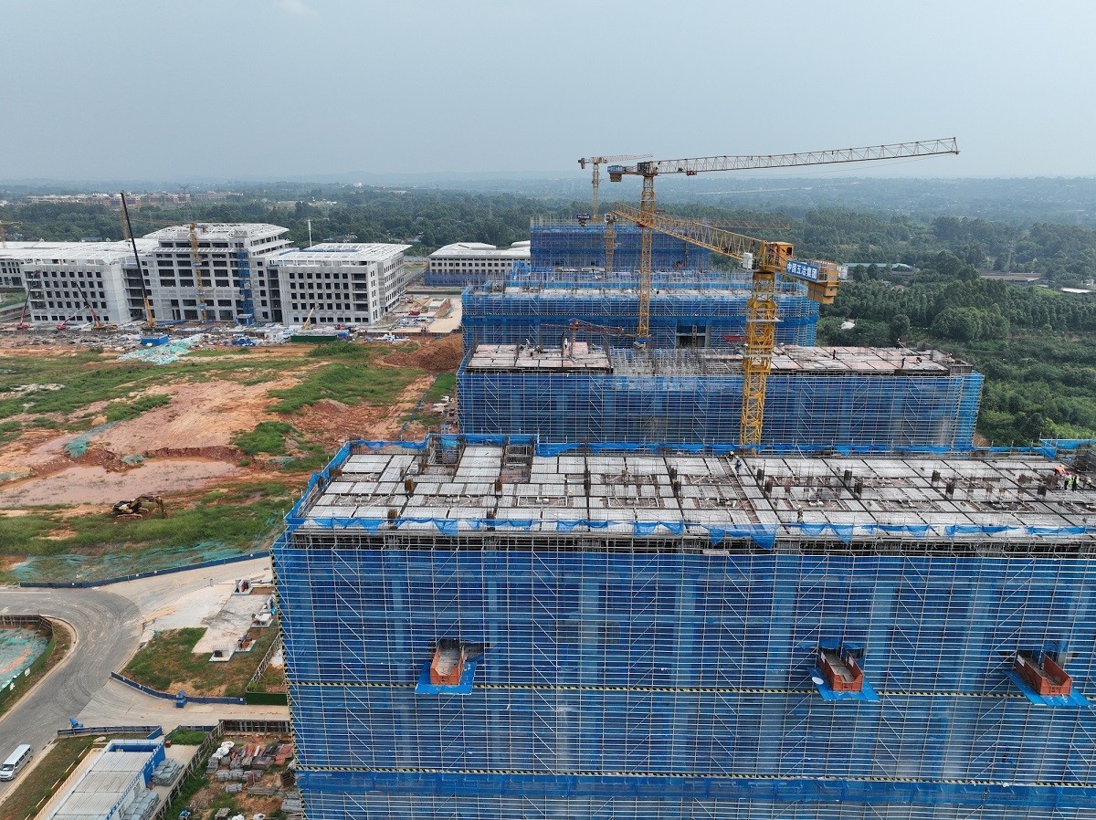 20余台塔吊和升降机有序吊运、80余台施工机械不停运转、上千名工人分布四处各司其职……8月9日,四川大学眉山校区建设项目现场一派繁忙景象。