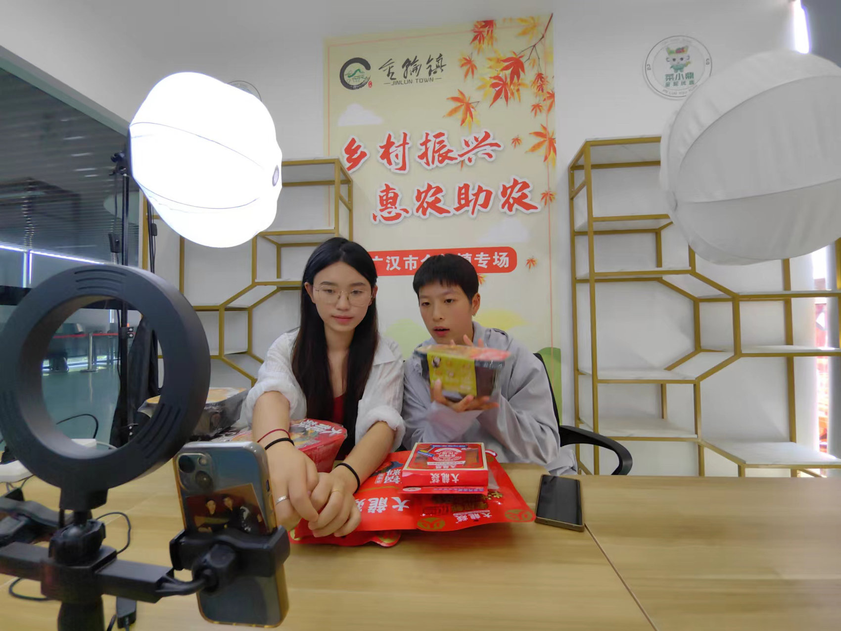 8月2日上午10点,在广汉市稻菜现代农业产业园区的特色农产品展销中心,主播雷婵和舒玲玲正在进行直播。这是金轮镇打造的惠农助农直播间,主要销售本地特色农副产品。