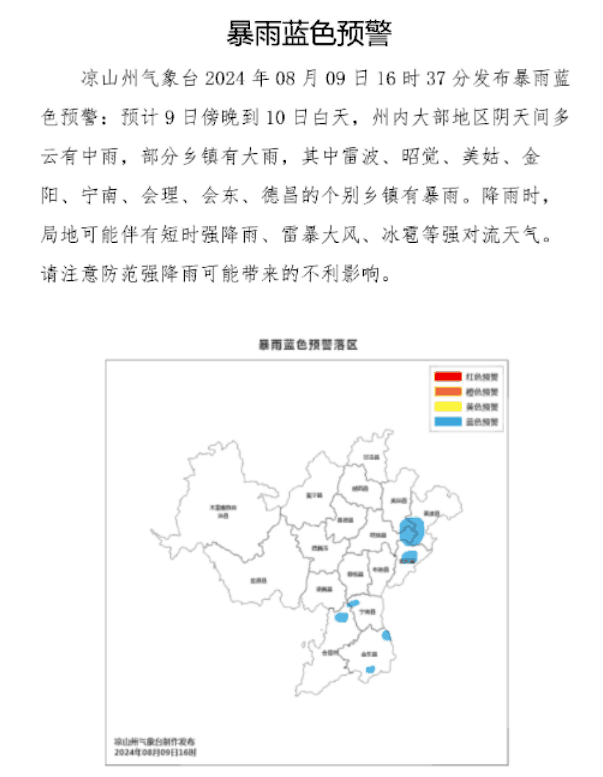当天下午,凉山州、攀枝花市、泸州市、内江市、阿坝州气象台也分别发布了暴雨蓝色预警,宜宾市气象台则先后发布了暴雨蓝色预警和大风黄色预警。