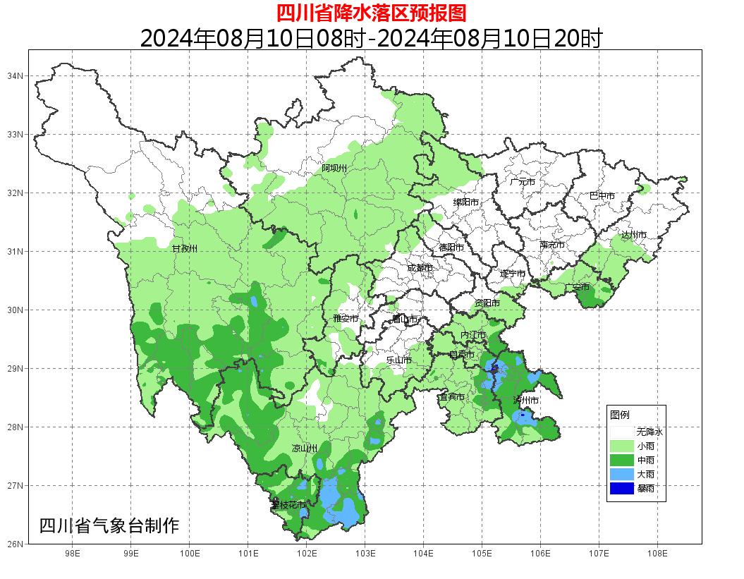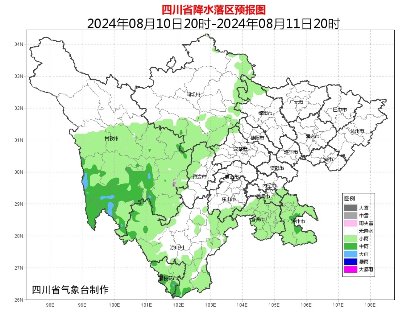 8月10日白天,达州、广安、资阳、内江、自贡、泸州、宜宾、雅安、乐山9市及盆地西部沿山阴天间多云有阵雨或雷雨,局部中到大雨,个别暴雨,盆地其余地方多云;川西高原大部和攀西地区阴天间多云有阵雨或雷雨,其中甘孜州南部和攀西地区西部南部有中雨,局部大雨。
