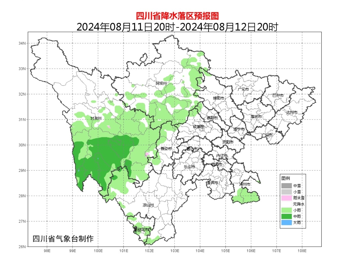11日晚上到12日白天,盆地大部晴,其中泸州市和西部烟山地区多云间阴有分散阵雨或雷雨;阿坝州东部南部、甘孜州中部南部和攀西地区西部多云间阴有阵雨或雷雨,局部中雨,川西高原和攀西地区其余地方多云间晴。
