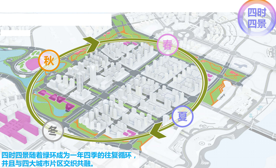 不仅如此,设计团队还在文旅岛、会展湾、健康谷以及智慧中城等四大城市片区,以春和、夏彩、秋爽、冬韵为主题进行了景观植被的初步规划配置,以实现“一城藏万象,四时皆有景”的独特风光。