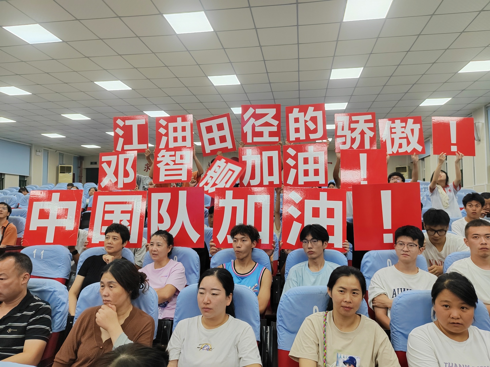 8月9日深夜,巴黎奥运会男子4×100米接力决赛即将开赛。在江油实验学校阶梯教室内,邓智舰的亲友团、江油市相关部门、社会各界代表,以及邓智舰母校江油实验学校田径队的师弟师妹相聚一堂,大家以集中收看电视直播的方式,为赛场上的“绵阳飞人”加油鼓劲。