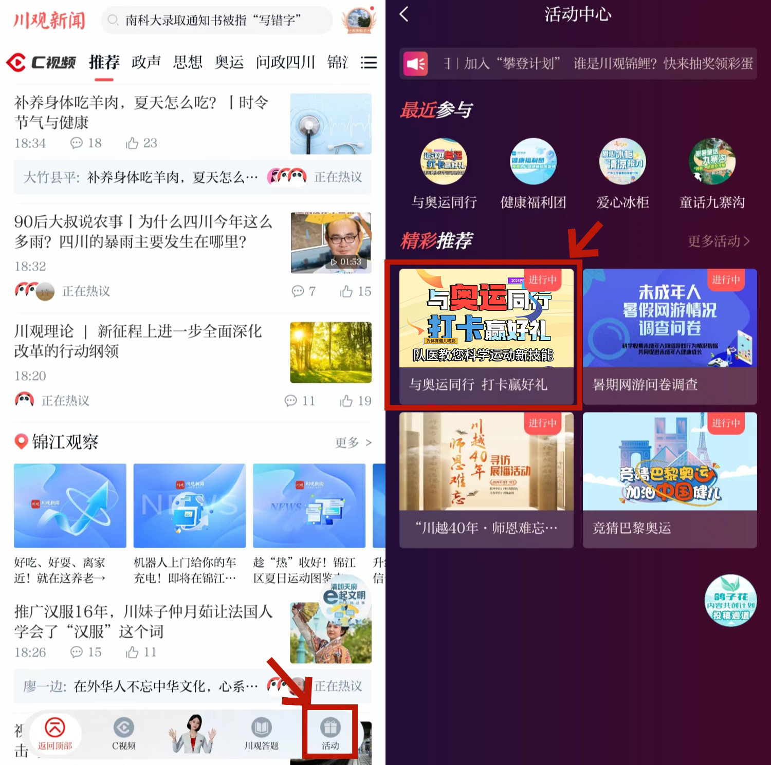 第二步:在川观新闻首页,点击右下角“活动”,进入活动中心,找到“与奥运同行,打卡赢好礼”图片,点击即可参与活动。