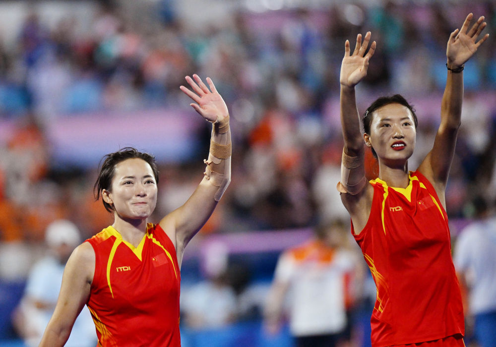8月9日,中国队球员欧紫霞(左)和李红在比赛后向观众致意。新华社记者 邬惠我 摄