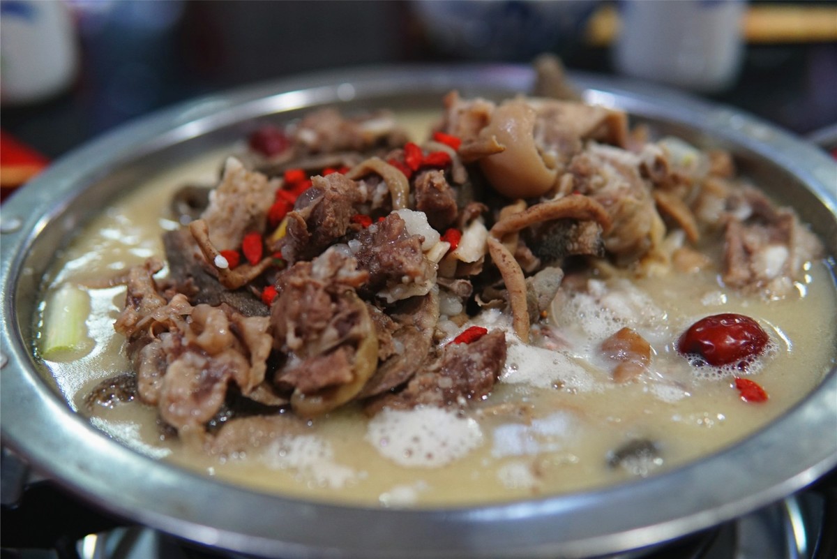 汤色乳白,切成块儿的羊肉随着汤里的咕噜泡上下翻滚,腾起的味儿一闻就是极致的鲜美。不用任何佐料,先来一口汤,由舌尖至胃,浓香层层递进……