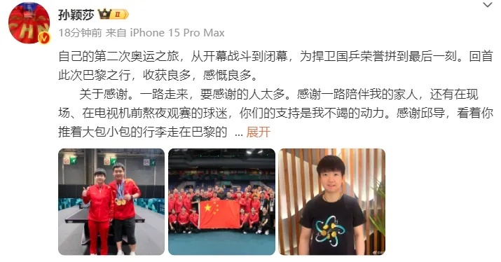 关于比赛。这次巴黎之行是有收获和遗憾的,或许这就是成长必须经历的过程。恭喜梦姐卫冕奥运会女单冠军,你的努力和表现值得向你学习!很荣幸与你们携手捍卫了中国女乒的荣耀!同时请大家理性看待输赢,继续支持中国乒乓球!