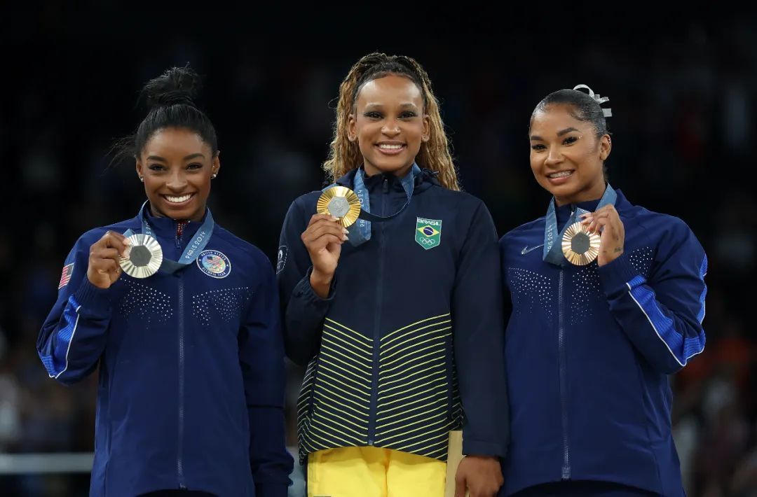 8月5日,冠军巴西选手安德拉德(中)、亚军美国选手拜尔斯(左)和季军美国选手奇利斯在颁奖仪式上。当日,巴黎奥运会体操项目女子自由操决赛在贝尔西体育馆举行。新华社记者 曹灿 摄