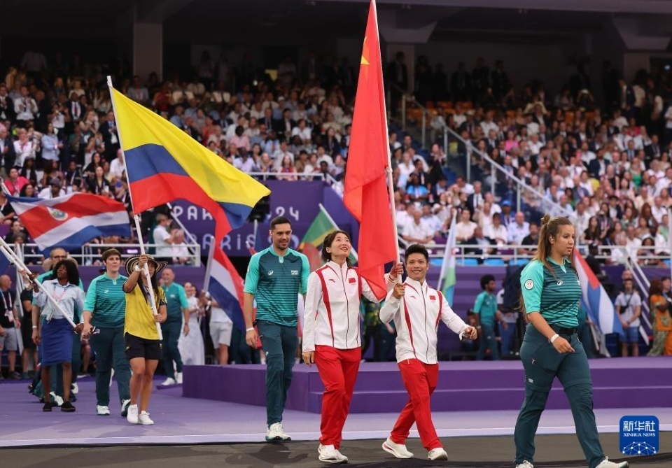 各代表团运动员代表依次入场。举重奥运冠军李发彬和女子曲棍球队队长欧紫霞作为中国体育代表团旗手,高举五星红旗出场。