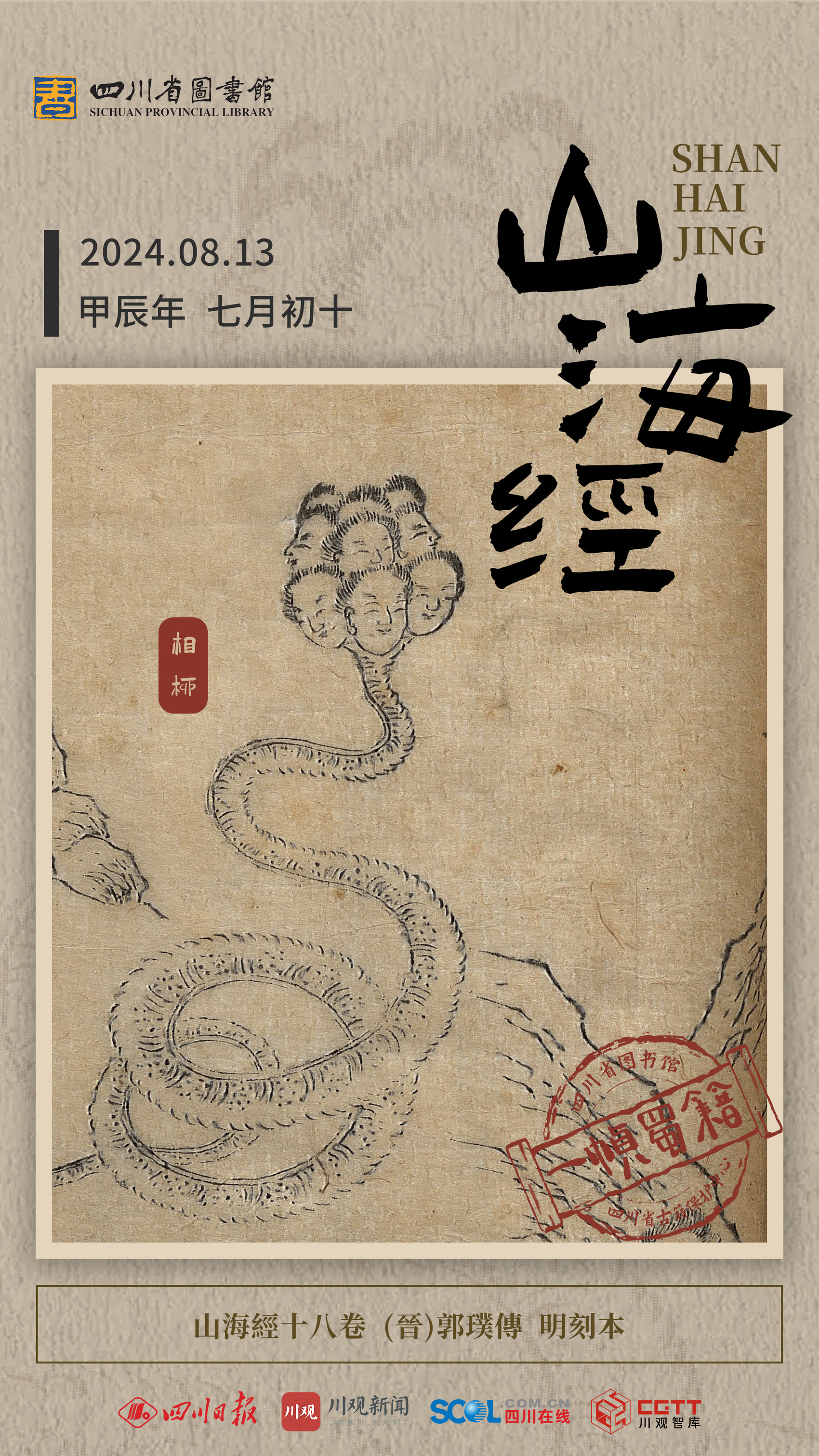 8月13日,一帧蜀籍带你走进《山海经》。海报图所选版本为《山海经十八卷》(晋)郭璞传 明刻本。