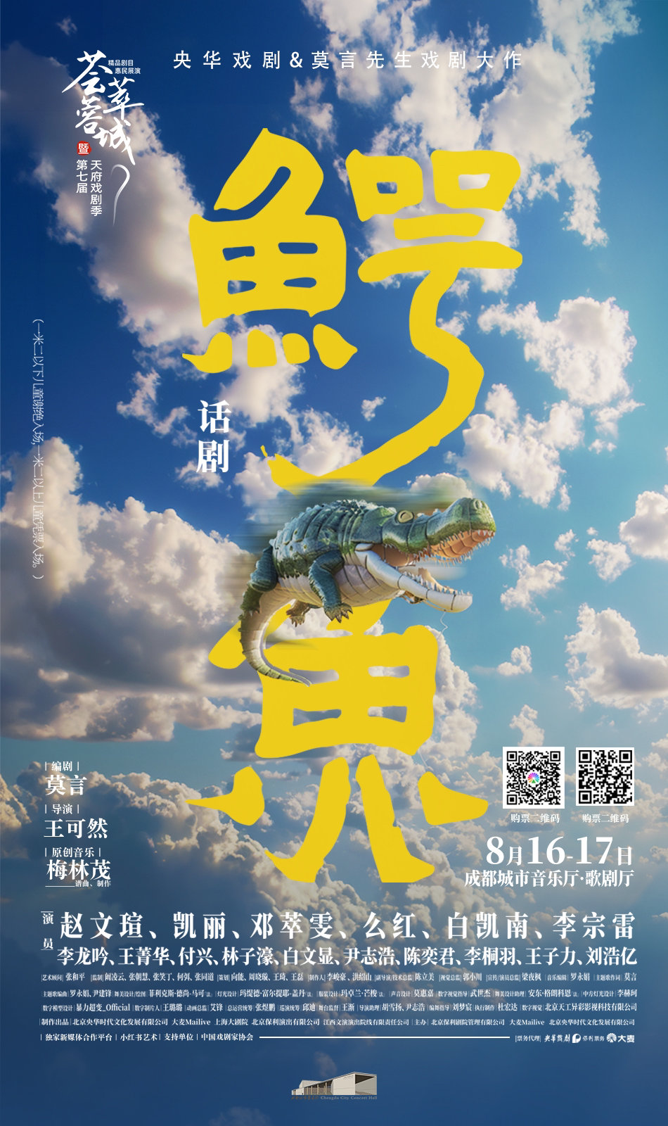 其中,备受关注的话剧《鳄鱼》将于8月16日率先上演。该剧是著名作家莫言创作的具有魔幻色彩的长篇话剧剧作,也是他获得诺贝尔文学奖后的首部原创话剧剧本,集结赵文瑄、凯丽、邓萃雯、么红、白凯南、李宗雷等一众“戏骨”,借由一条无限生长的、会说话的鳄鱼,挖掘人性深处的秘密,深刻探讨“欲望”这一主题。
