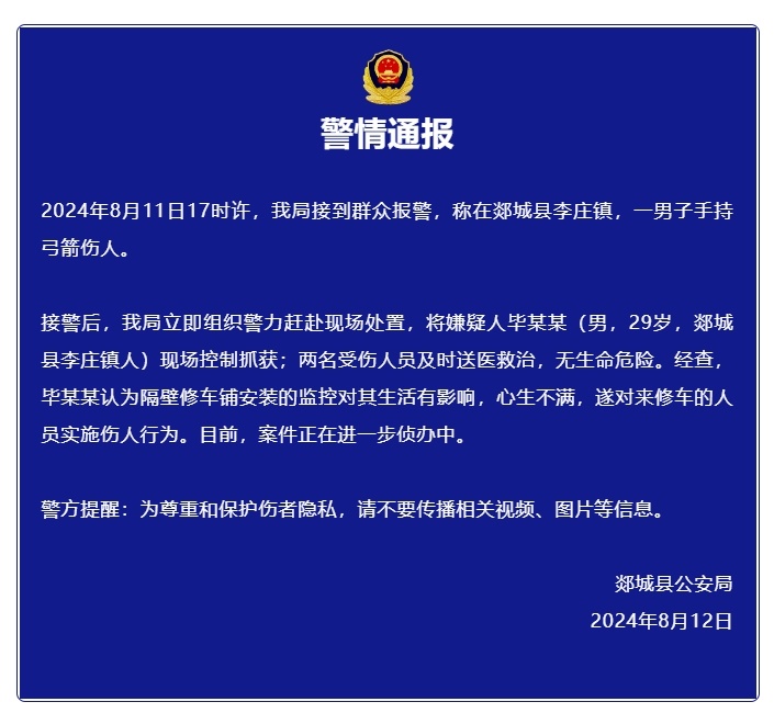 8月12日,“临沂公安”微信公号发布通报:2024年8月11日17时许,我局接到群众报警,称在郯城县李庄镇,一男子手持弓箭伤人。