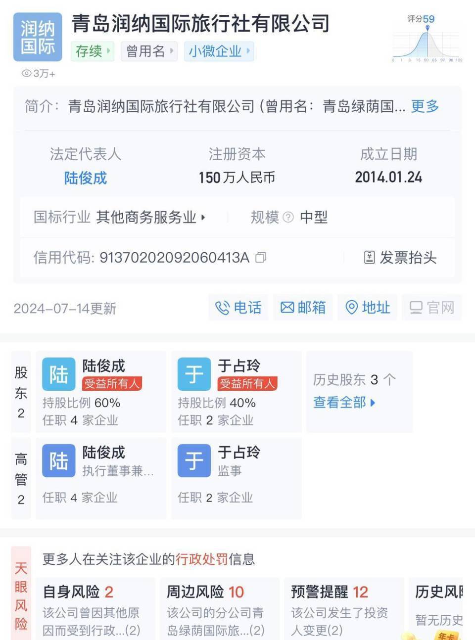 据了解,该导游为青岛润纳国际旅行社有限公司的雇员。天眼查大数据显示,青岛润纳国际旅行社在2024年7月上半月内被投诉了19次,主要问题集中在旅游团组的宣传行程与实际行程不符、不履行合同约定或退团、退定金等方面的纠纷。