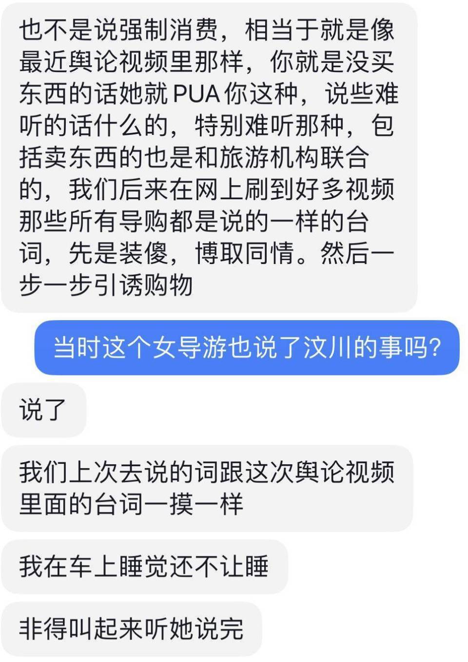“就是像最近被曝出的视频那样,就是你没买东西的话,她(女导游)就PUA你,说些难听的话。”金女士说,当时这名女导游也曾说了汶川地震的话题,和这次视频曝光的台词几乎一模一样。而且,在旅途中,导游多次带领他们进入购物点,每次停留时间长达3小时,还公然要求游客回到车内自行报出购物花费的金额,对未购物的游客进行指责。