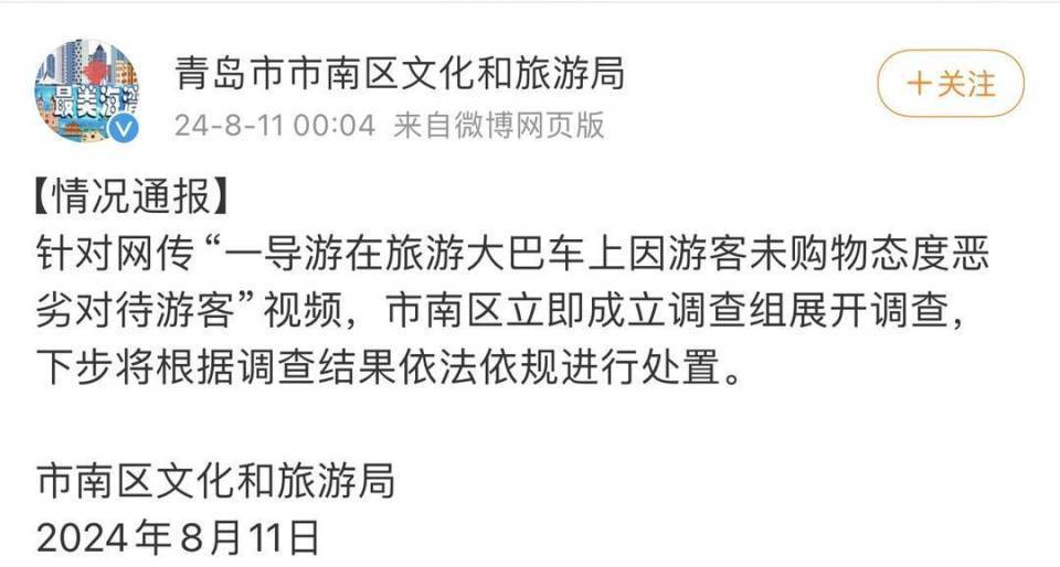 8月11日,青岛市市南区文化和旅游局发布情况通报:针对网传“一导游在旅游大巴车上因游客未购物态度恶劣对待游客”视频,市南区立即成立调查组展开调查,下步将根据调查结果依法依规进行处置。