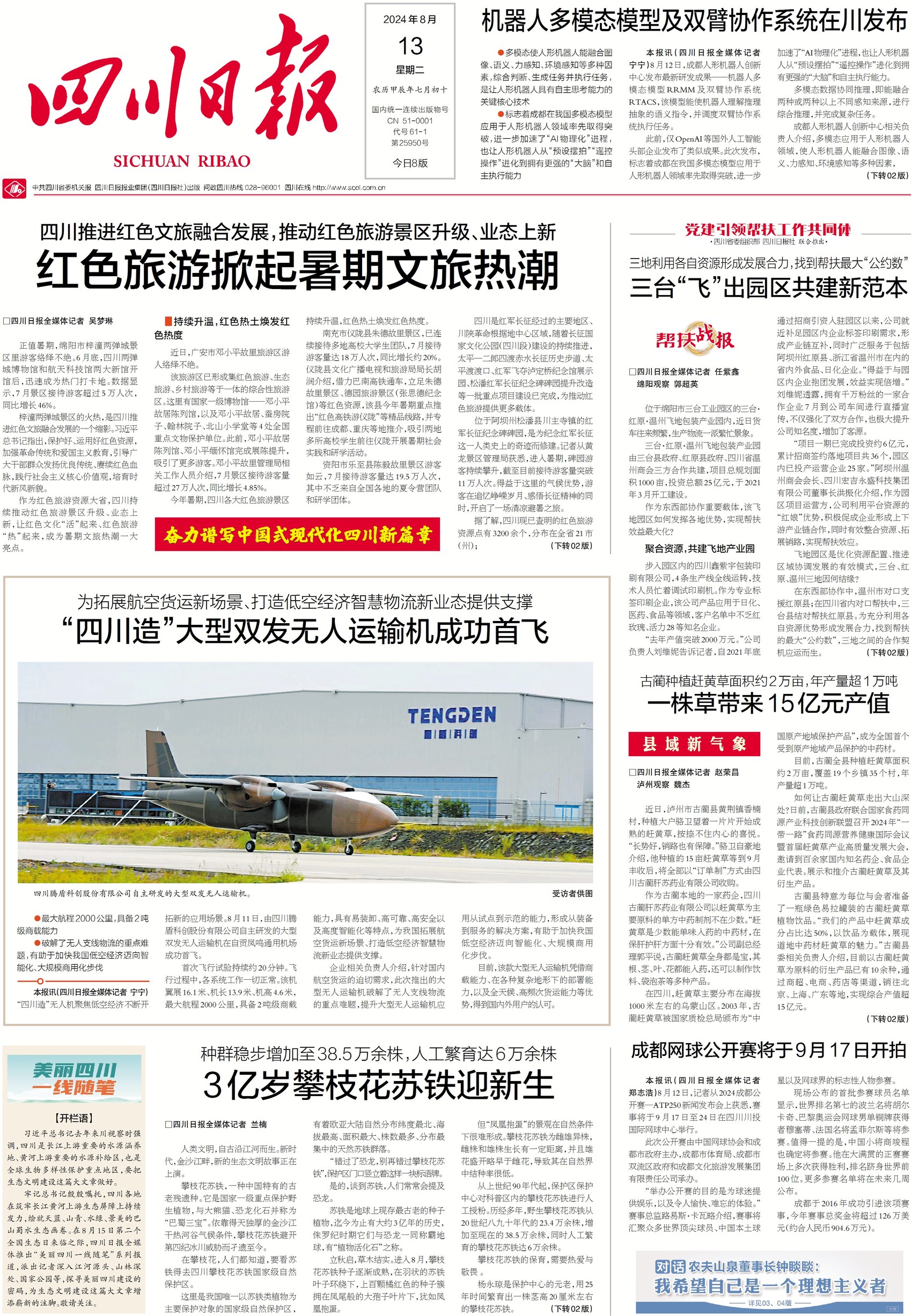 低空经济又迎来发展新动态。8月11日,“四川造”大型双发无人运输机成功首飞,最大航程2000公里,具备2吨级商载能力。此次推出的大型无人运输机破解了无人支线物流的重点难题,有助于加快我国低空经济迈向智能化、大规模商用化步伐。今日一版,共同关注低空经济智慧物流新业态。