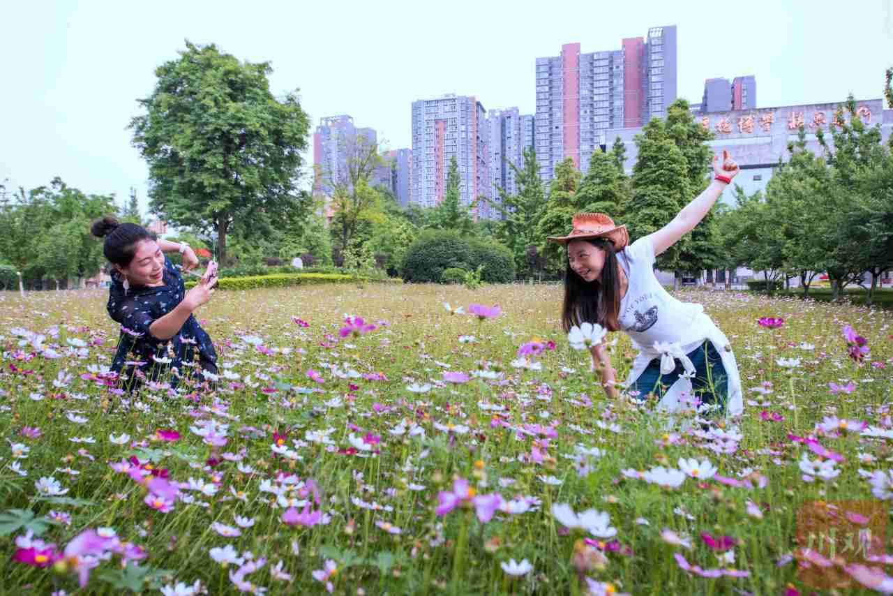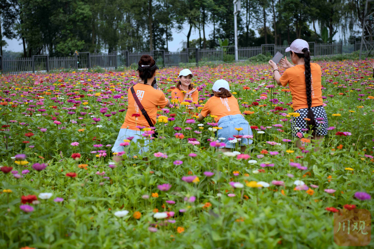 14 |游人在温江区柳城街道中医大花海拍照留念。
