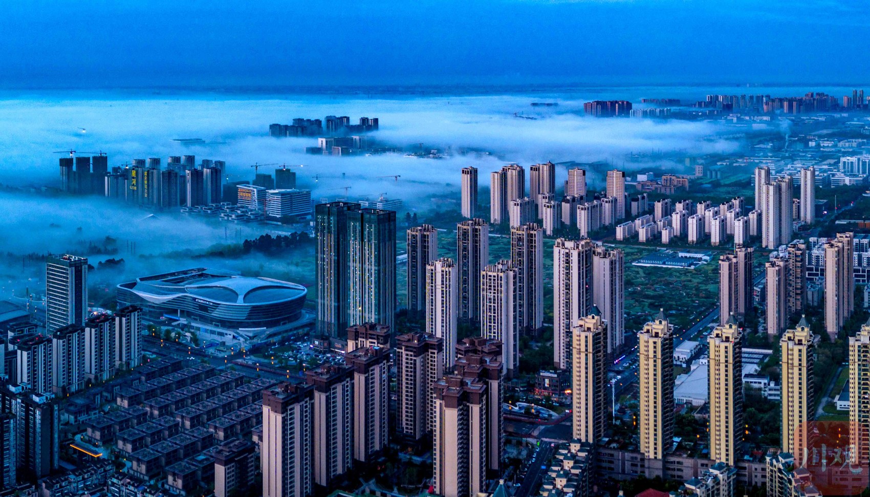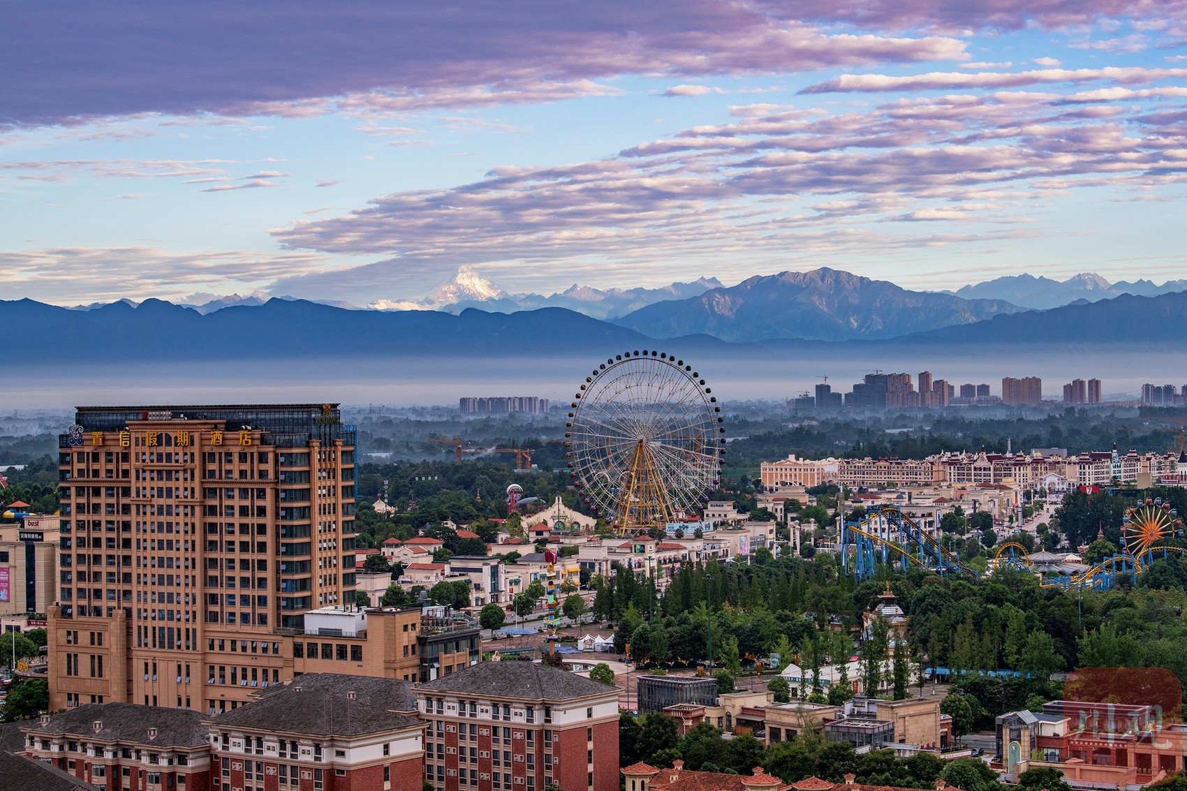 01 |清晨,温江区万春鹭湖宫在轻纱般的晨雾中若隐若现,与远处皑皑雪山交相辉映。