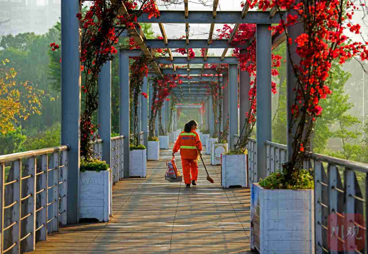 11 |温江区柳城街道光华公园廊桥,清洁工正专注清扫,保持环境整洁。