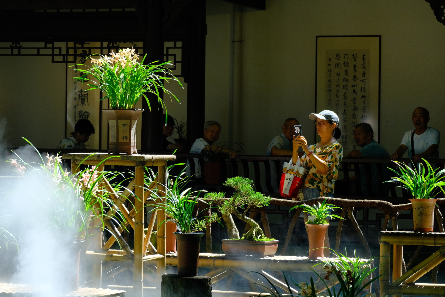 游客在成都杜甫草堂博物馆赏兰、品兰。