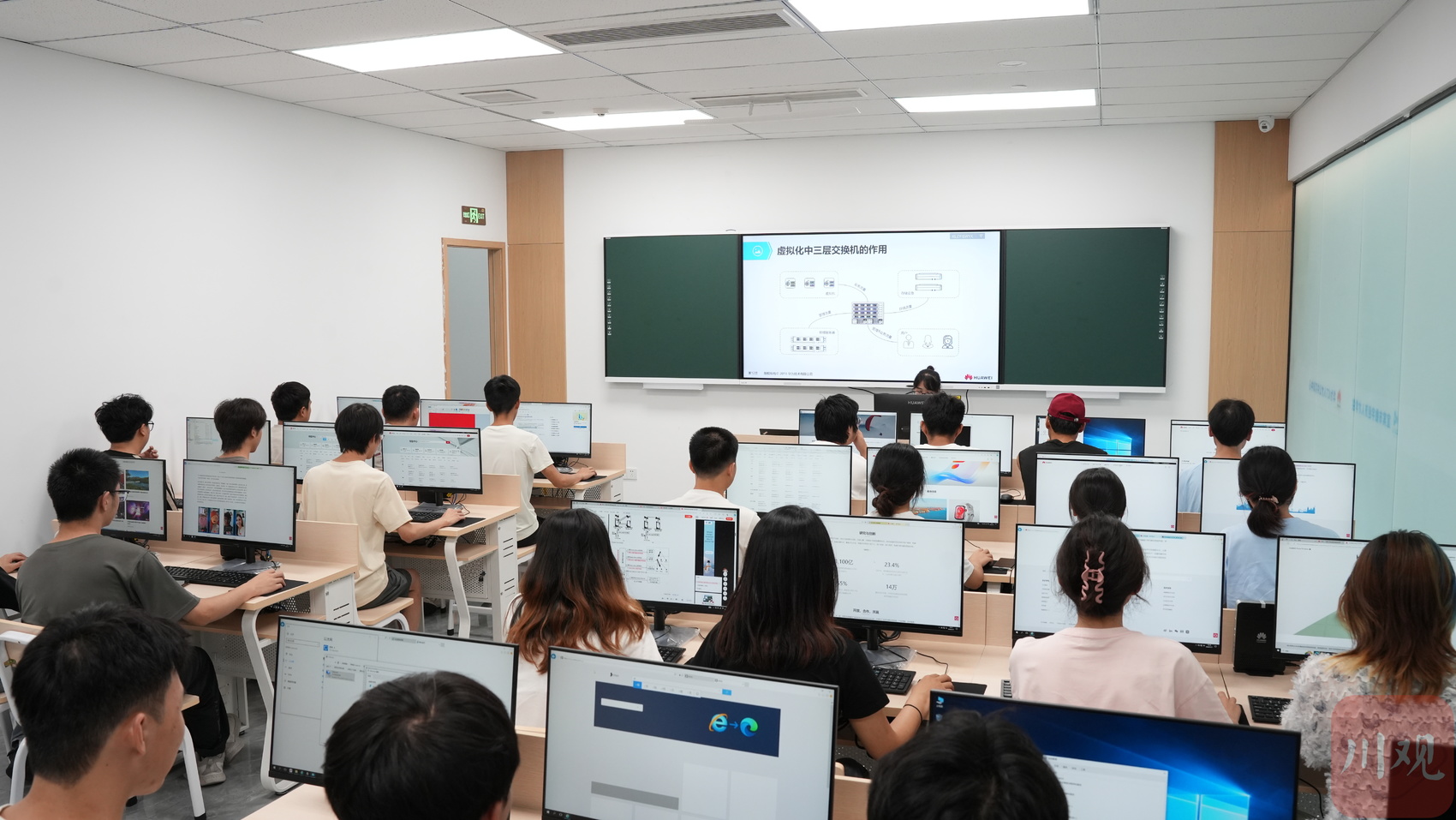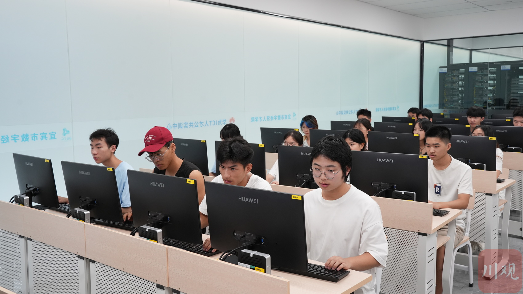 正值暑假,在宜宾市数字经济人才学院数通安全实训室内,来自四川轻化工大学、西华大学、宜宾职业技术学院的20余名大学生正在进行数据通信课程培训,与在学校不同,这里的讲师来自华为等头部企业,可以让学生体验最前沿实用的课程培训内容并现场进行实操。