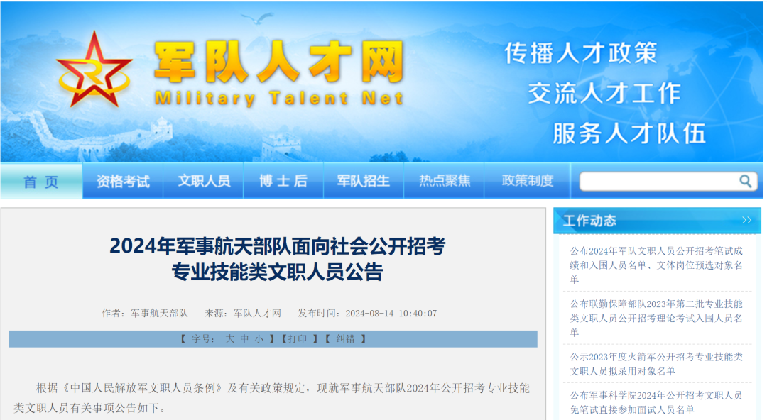 根据《中国人民解放军文职人员条例》及有关政策规定,现就军事航天部队2024年公开招考专业技能类文职人员有关事项公告如下。