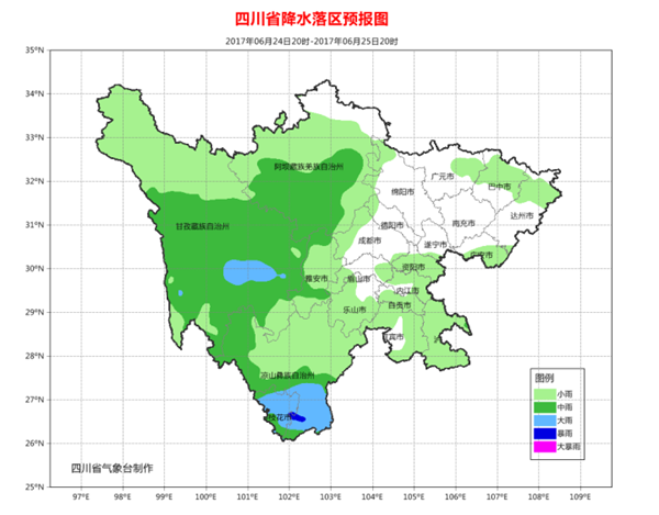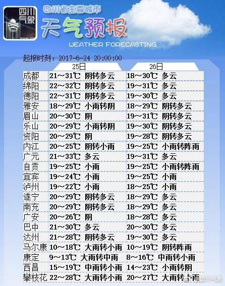 25日晚上到26日白天:盆地各市多云,其中内江、自贡、宜宾、泸州、乐山、雅安及巴中、达州2市北部多云间阴有分散性阵雨,局部地方有中雨;川西高原和攀西地区多云间阴有雷雨或阵雨,其中阿坝州西部、甘孜州南部和攀西地区部分地方有中雨,局部大雨。