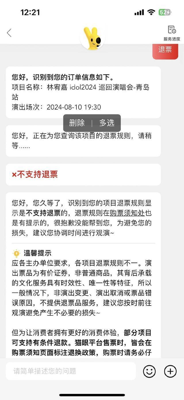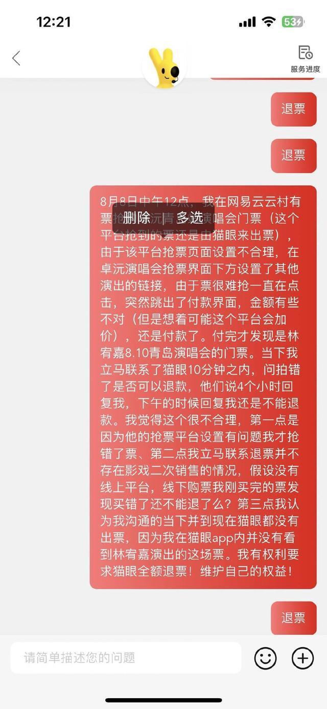 容女士和猫眼平台沟通退票