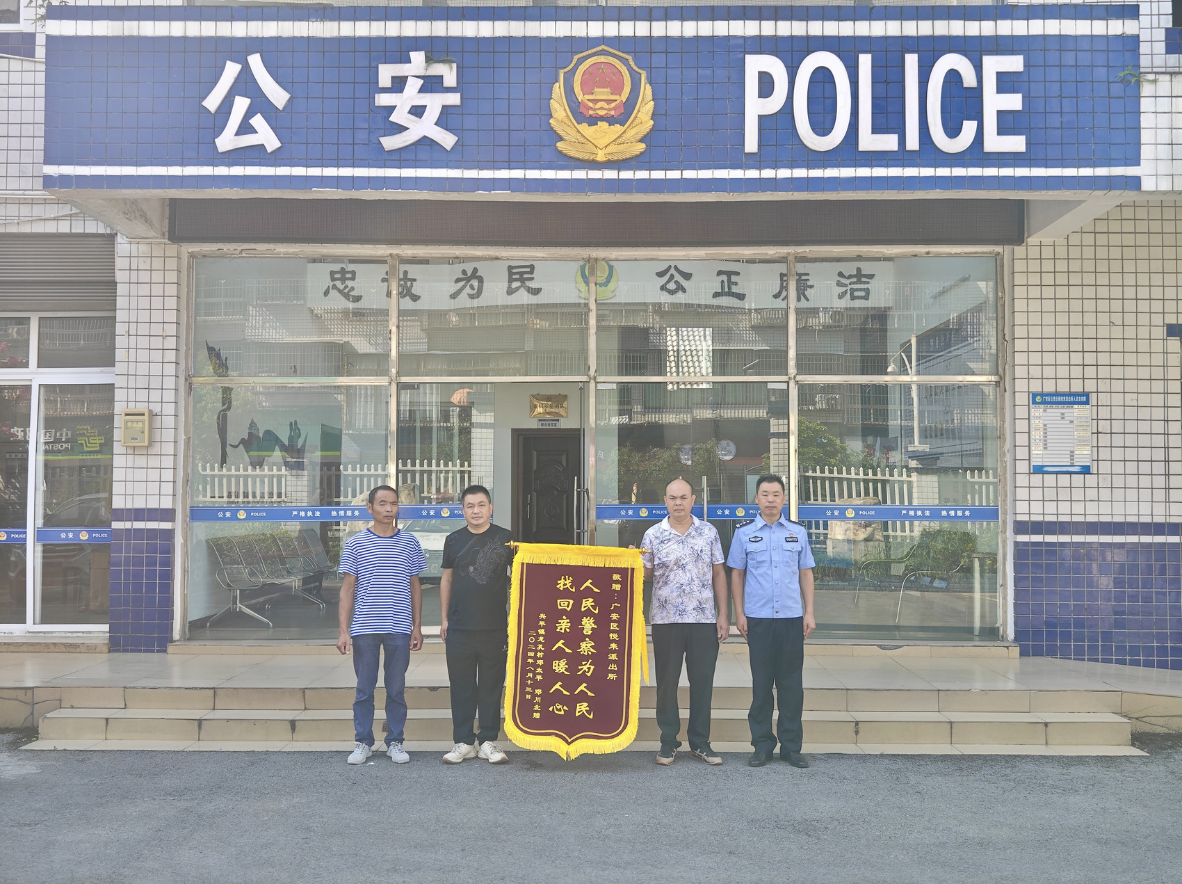 “警察同志,实在是太感谢你们了。”8月13日上午,广安市公安局广安区分居悦来派出所内,来自广安区兴平镇龙孔村的邓太平、邓川北两兄弟将一面锦旗送到民警手中,表达对派出所全体人员的感激之情。