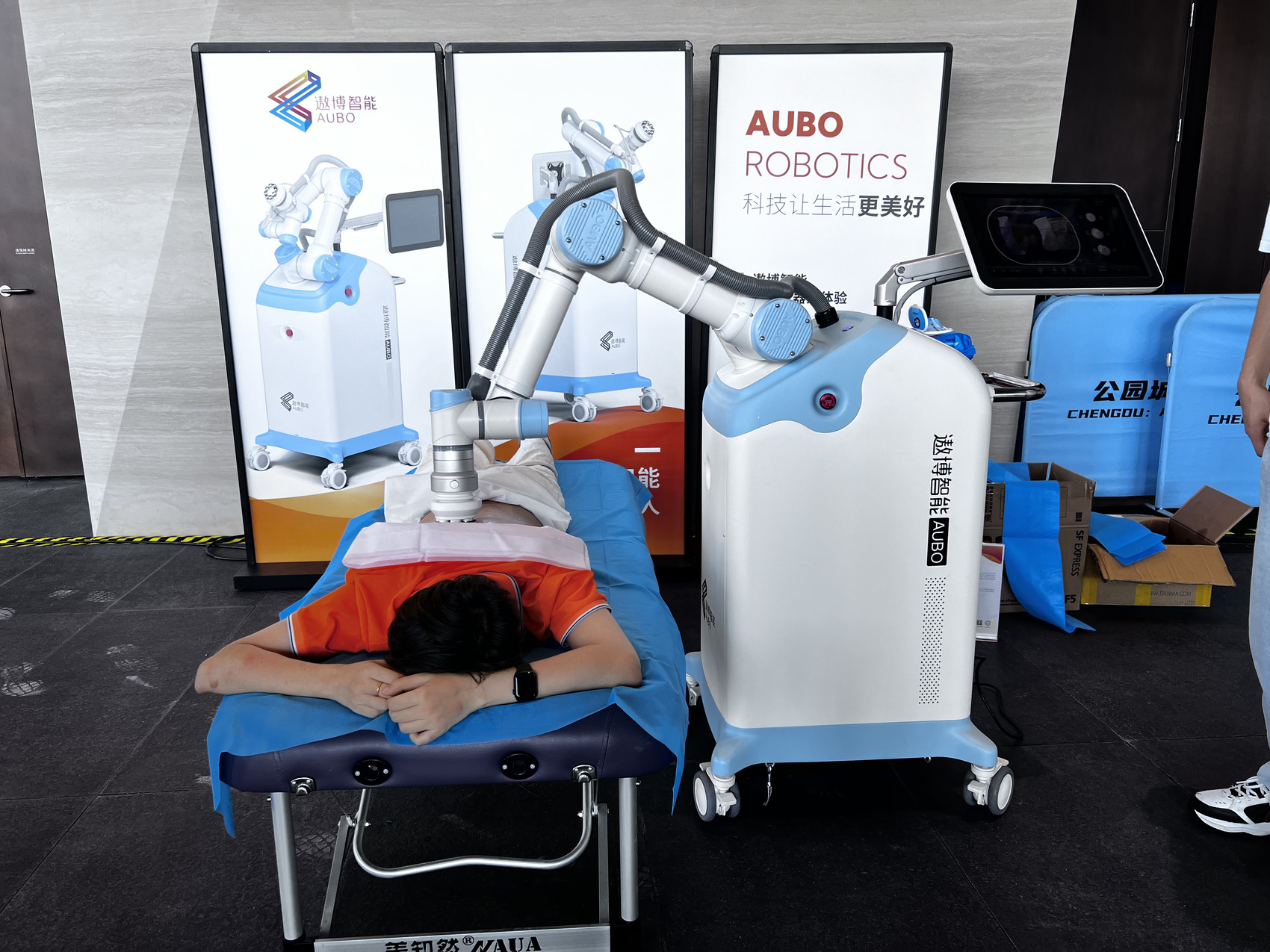 一键启动,循穴而动,机械臂轻触游客背腹,这是一款射频理疗按摩机器人可以提供的服务。