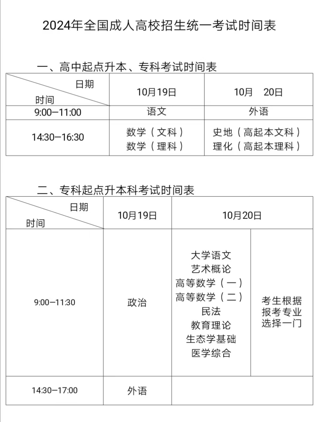 8月16日,省招考委、教育厅公布了《四川省2024年全国成人高校招生实施规定》(以下简称《规定》)。根据《规定》,全国成人高校招生全国统一考试定于10月19日、20日举行,高中起点本、专科每科考试时间为120分钟,专升本每科考试时间为150分钟,具体考试科目及时间安排见下表。