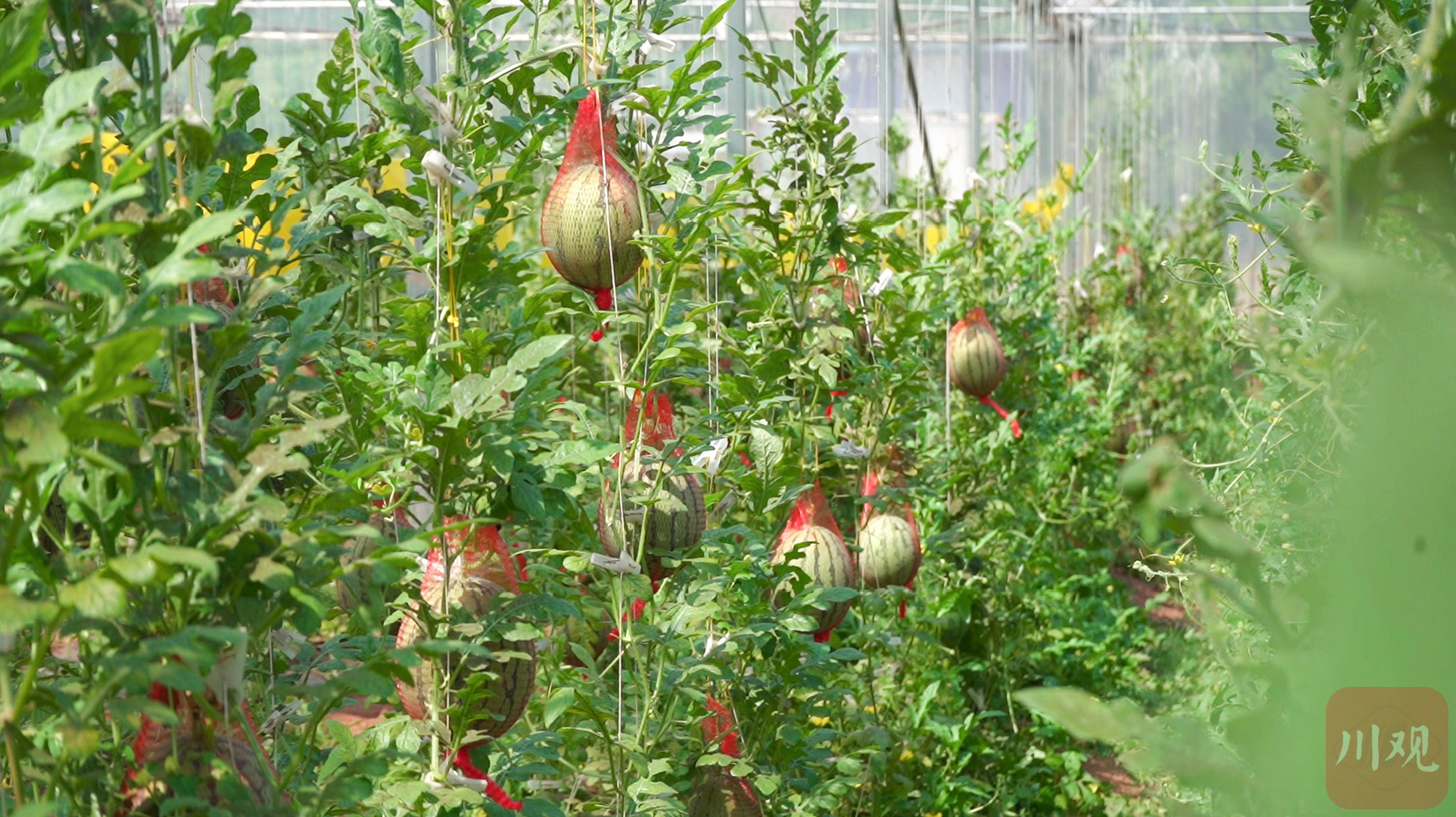 8月15日,遂宁市安居区聚贤镇和平村美宁食材现代农业示范基地内,第二季冰淇淋西瓜陆续成熟。走进大棚,眼前的景象与平日见到的西瓜地大有不同:一排排整齐的瓜蔓向上茁壮攀升,每一株瓜蔓上仅有一颗西瓜吊挂在半空中。