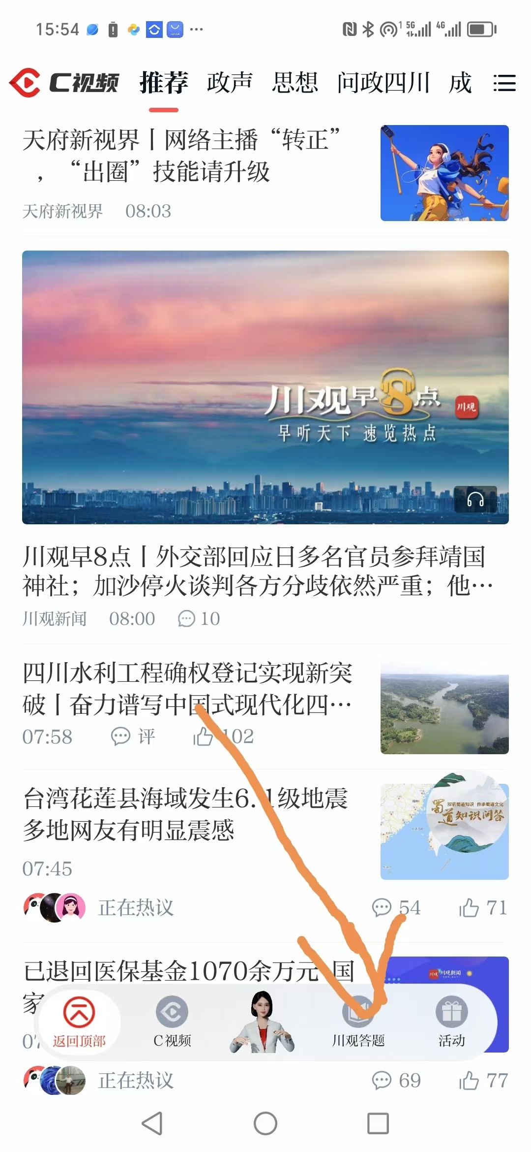 方式二:在川观新闻首页,点击下方“川观答题”,找到蜀道知识问答活动图片,点击即可参与活动;