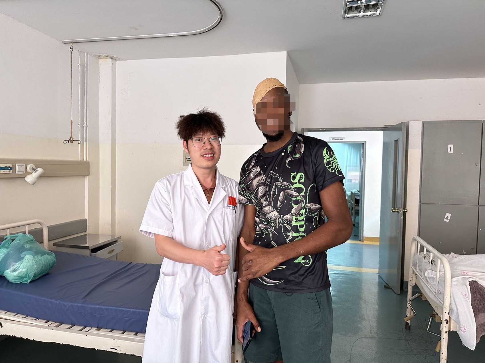 刘欢展示的“中国医术”得到了当地医护人员和患者的称赞。其中最为惊险的,是今年7月底接诊的一名颅脑外伤患者。一名27岁的男青年在逛街时遭遇意外,被一把带锈的刀刺入头部,刀体大部分刺穿颅骨后进入颅腔脑组织。患者在转运过程还出现了头痛、呕吐、意识障碍等症状,病情危重。