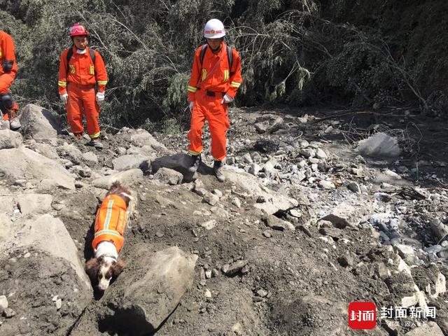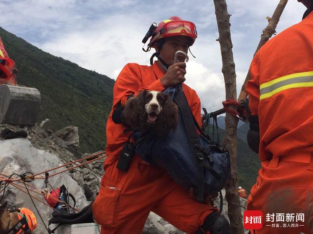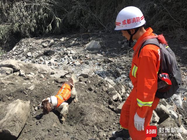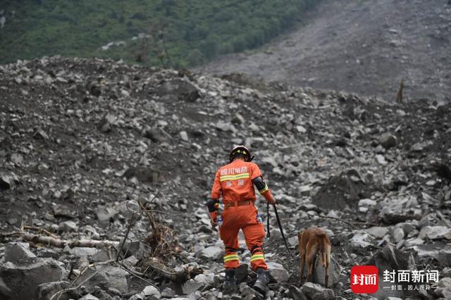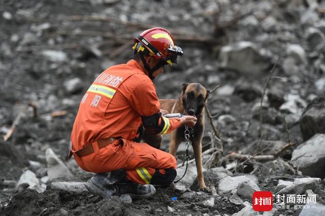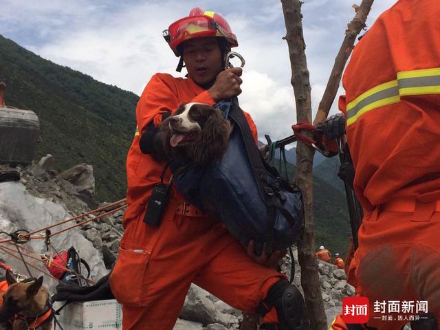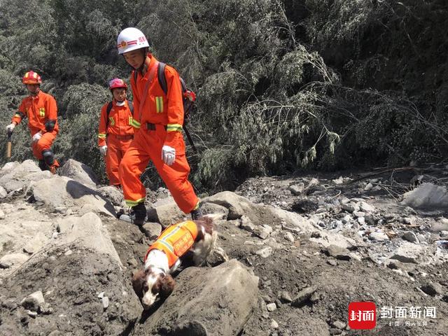 茂县山体垮塌搜救现场,四川消防总队调集的各支队除了搜救队员外,还有英勇的战友搜救犬。