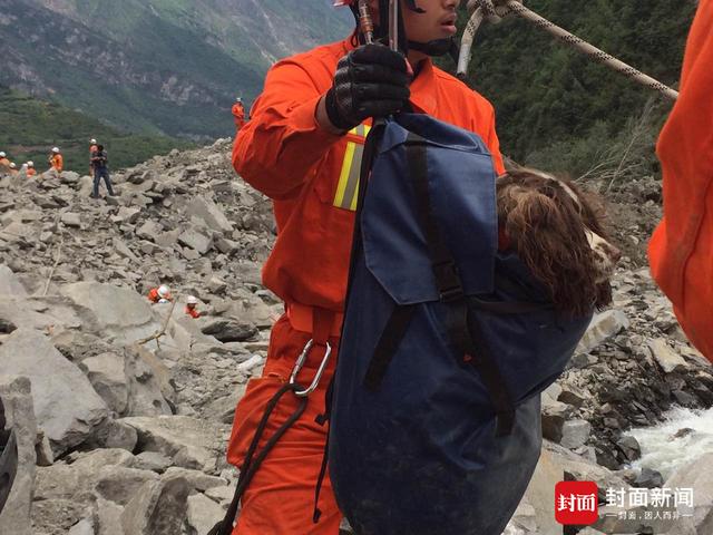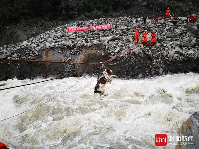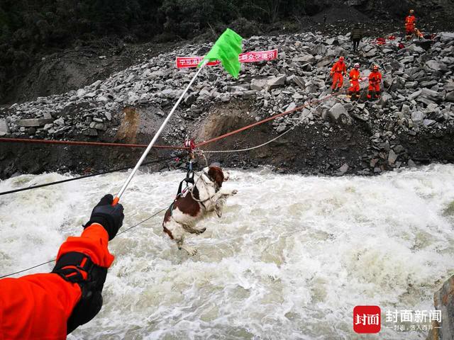 25日中午,封面新闻记者目击了一个惊心动魄的救援镜头:三岁的搜救犬“安澜” 吊溜索横渡湍急的江水,到对岸实施新一个点位的搜救。