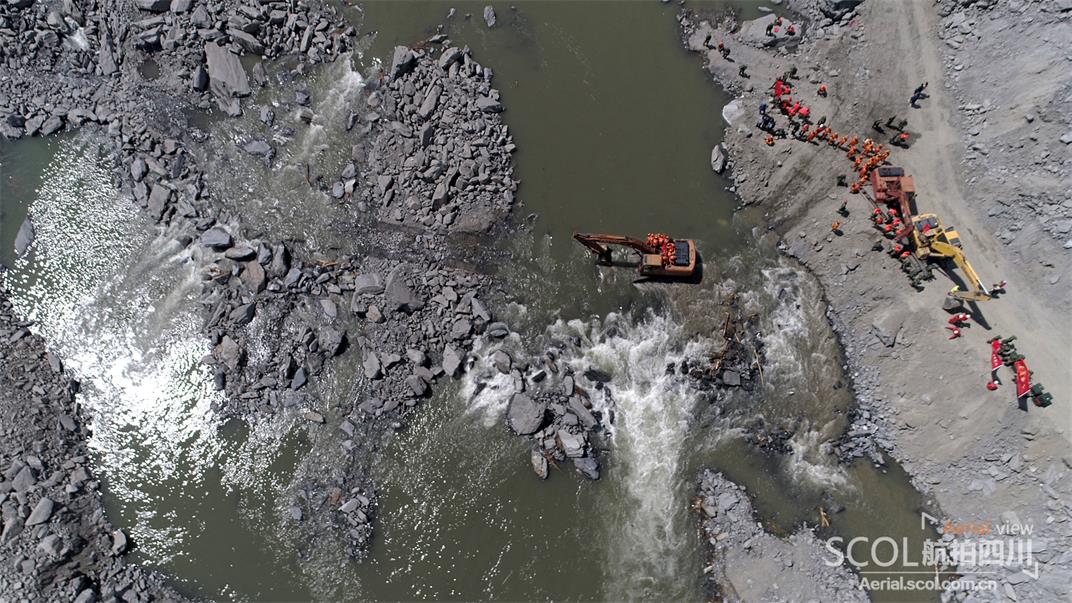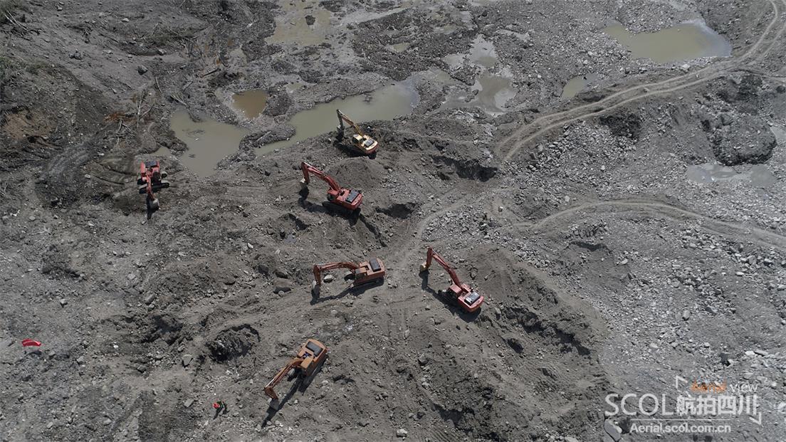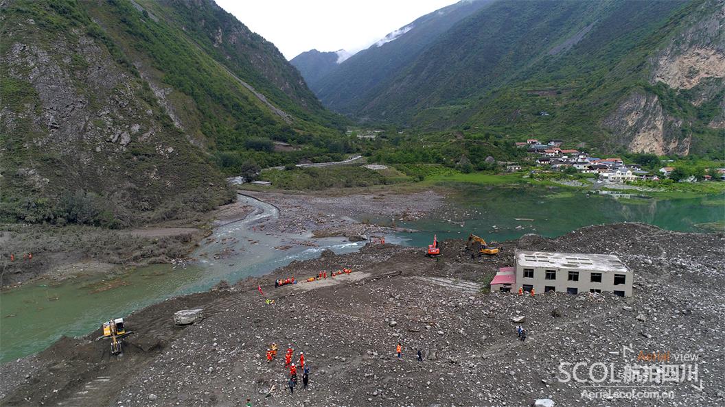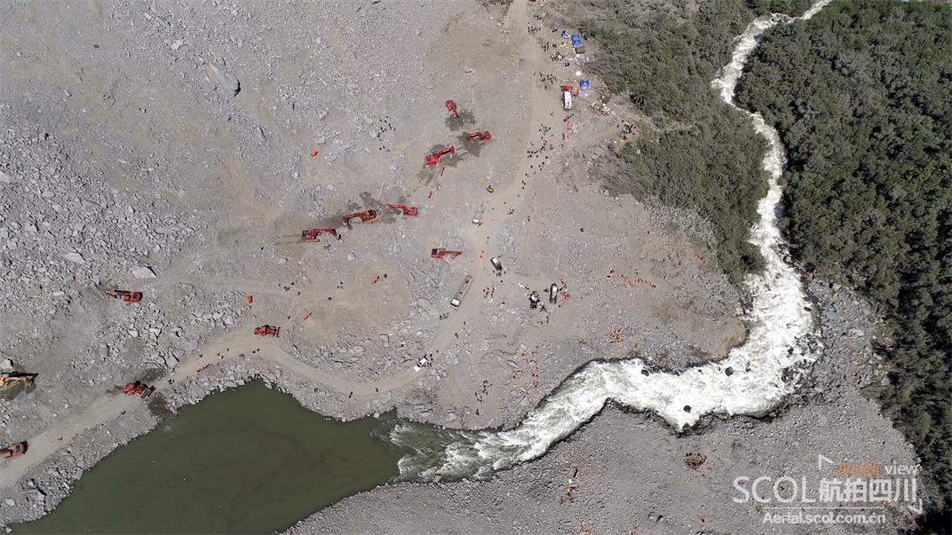 通过航拍图显示,滑坡体阻塞河道,最窄处仅余20米左右宽度。在新形成的河道两侧,均有搜救队伍在现场搜索救援。