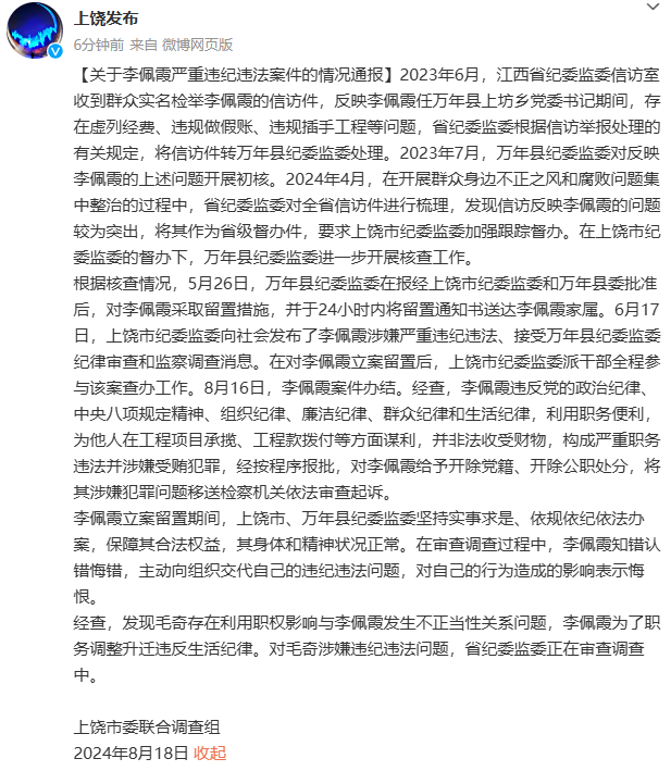 李佩霞立案留置期间,上饶市、万年县纪委监委坚持实事求是、依规依纪依法办案,保障其合法权益,其身体和精神状况正常。在审查调查过程中,李佩霞知错认错悔错,主动向组织交代自己的违纪违法问题,对自己的行为造成的影响表示悔恨。