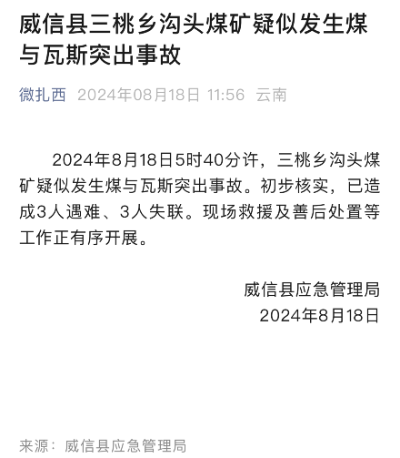 据“微扎西”公众号消息,2024年8月18日5时40分许,三桃乡沟头煤矿疑似发生煤与瓦斯突出事故。初步核实,已造成3人遇难、3人失联。现场救援及善后处置等工作正有序开展。