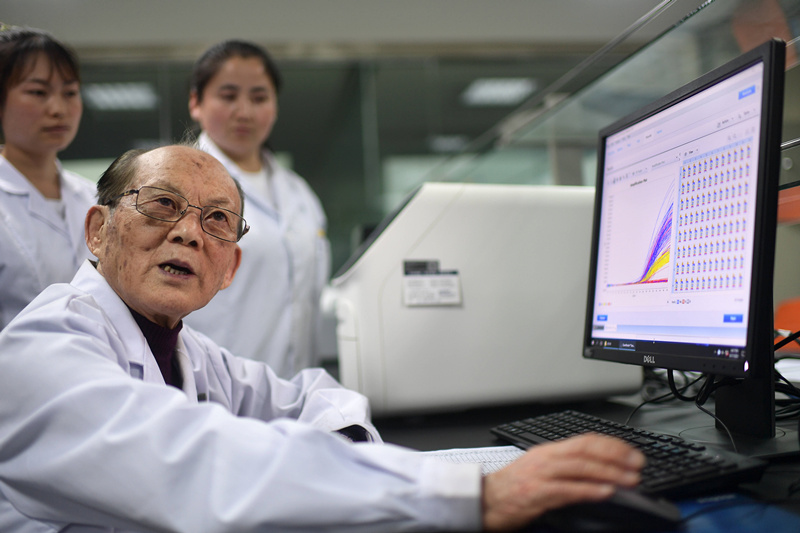 2021年6月17日,吴天一(前)在青海西宁的实验室内和学生讨论。