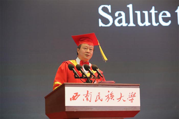 亲爱的同学们,几年前,你们离开家乡,怀着自己的梦想,来到成都我们的大学,成为一名西南民大人。几年来,我们朝夕相处,风过于耳、花开于心,有过挫折困惑失望,但从未放弃抛弃后悔,共同见证了学校的发展进步成长。你们用青春歌唱这里的每一寸土地,用激情燃烧这里的每一段时光,成为学校最忠实的朗读者。