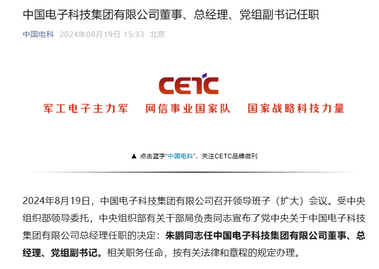 据中国电科消息,2024年8月19日,中国电子科技集团有限公司召开领导班子(扩大)会议。受中央组织部领导委托,中央组织部有关干部局负责同志宣布了党中央关于中国电子科技集团有限公司总经理任职的决定:朱鹏同志任中国电子科技集团有限公司董事、总经理、党组副书记。相关职务任命,按有关法律和章程的规定办理。