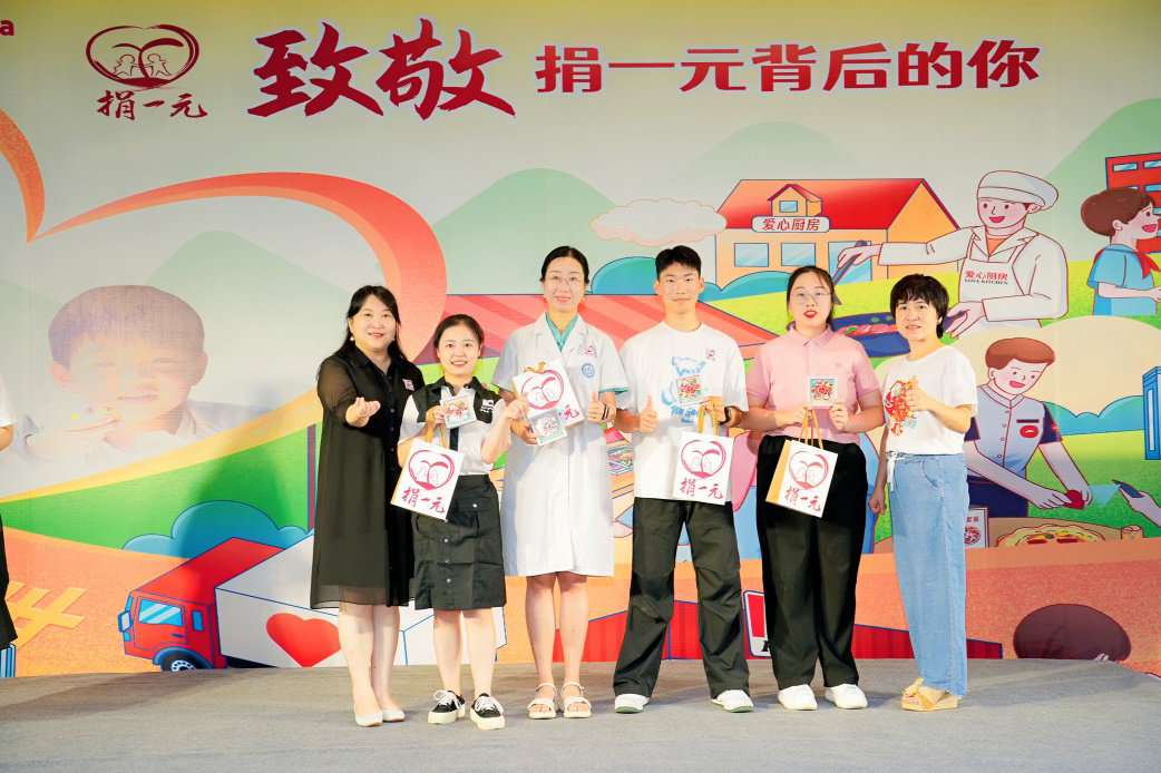 在爱心义卖集市现场,一直持续支持“捐一元”公益项目的张乐炀同学和来自四川大学华西医院的吴昕医生也受邀与来自肯德基、必胜客的月捐达人一起,接受百胜中国代表颁发的“捐一元”爱心组合徽章,致敬热爱做公益的他们。
