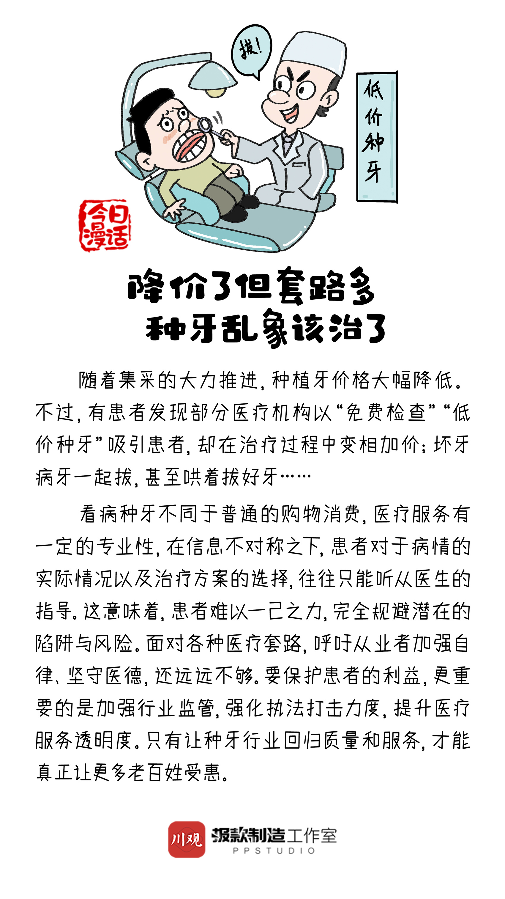 随着集采的大力推进,种植牙价格大幅降低。不过,有患者发现部分医疗机构以“免费检查”“低价种牙”吸引患者,却在治疗过程中变相加价;坏牙病牙一起拔,甚至哄着拔好牙……对此,你怎么看?