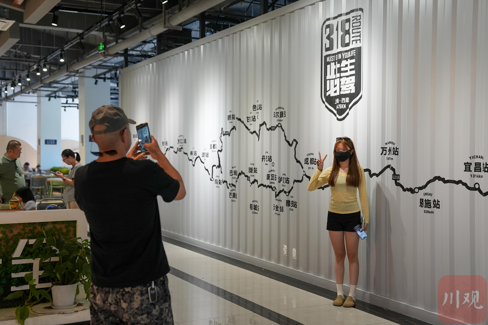 游客在服务区内的特色商店拍照打卡。