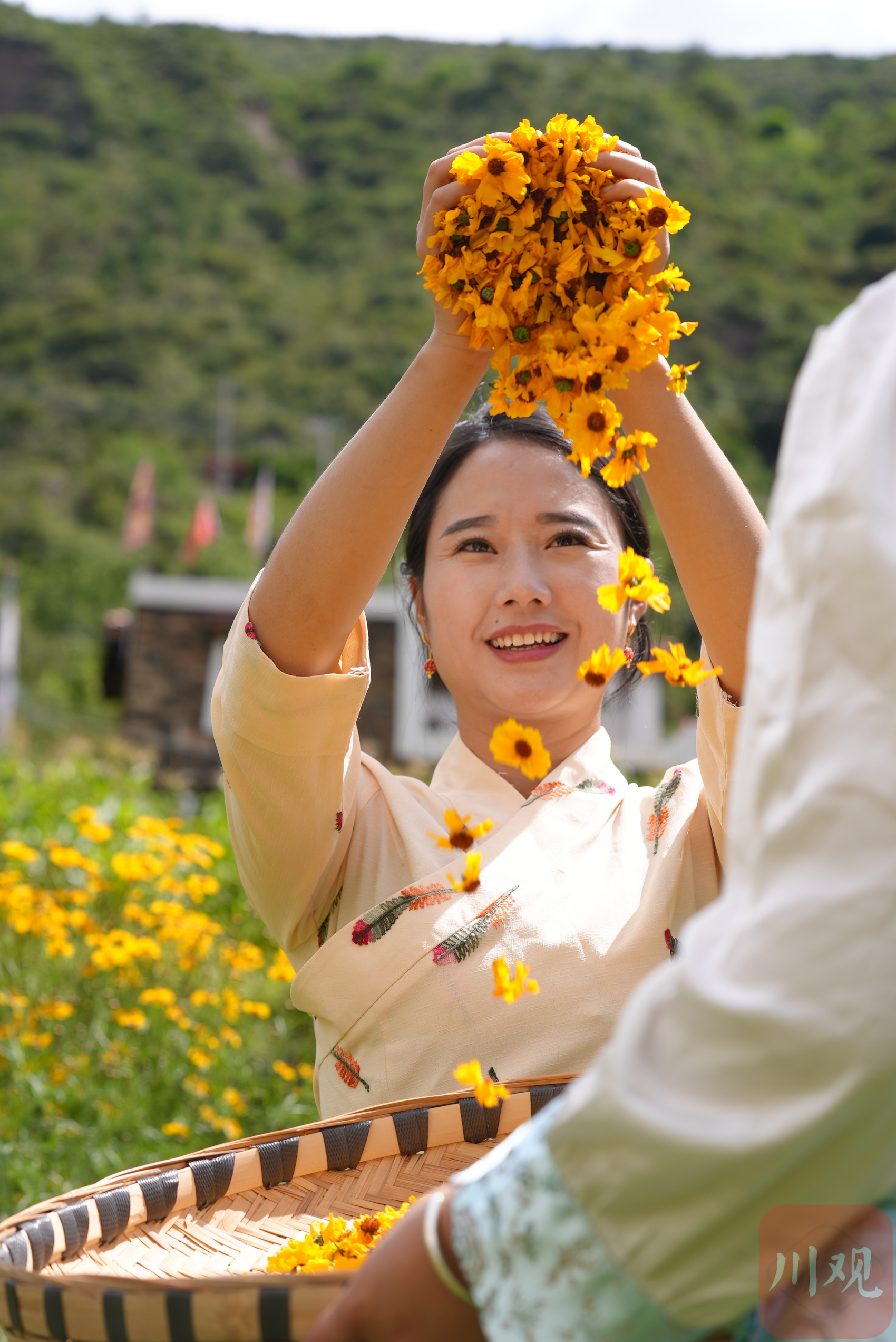 国道317旁的阿坝州金川县二嘎里乡二嘎里村高原雪菊产业基地一片金黄,迎来了采摘季。