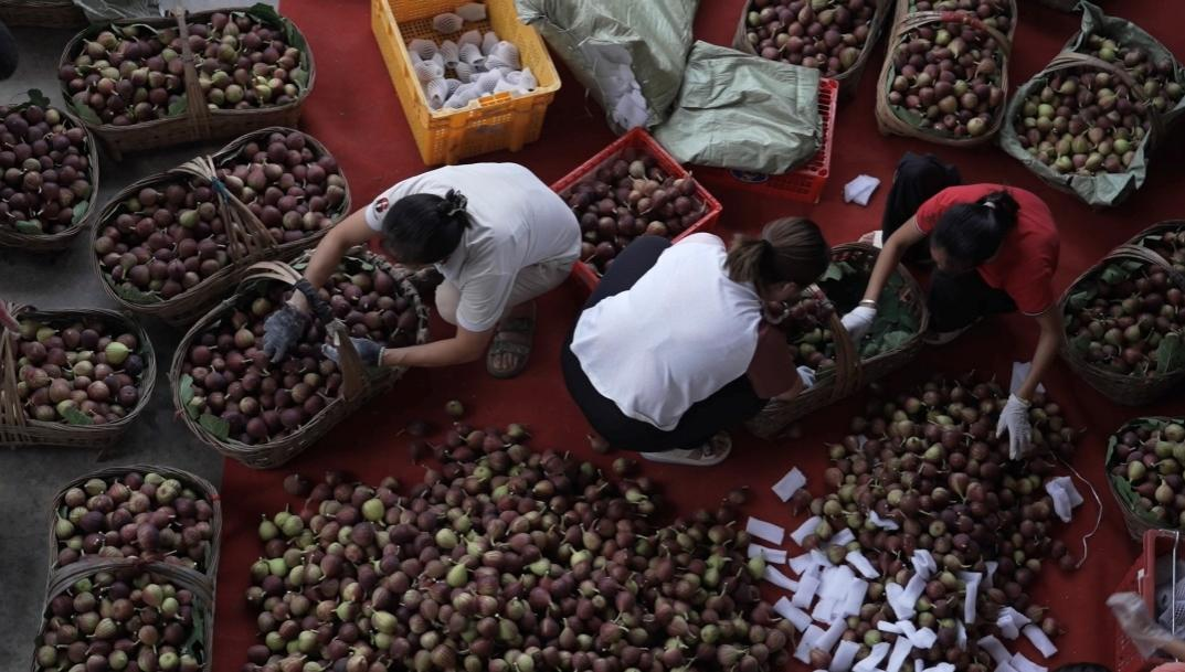 新鲜的无花果会有专门的女工负责处理:分拣、套袋、装筐……中午时分,统一装车,拉到仓库,然后再分装、封箱,发往全国各地。