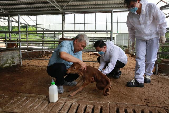 专家和技术人员为犊牛饲喂牛乳、按摩辅助。受访者供图